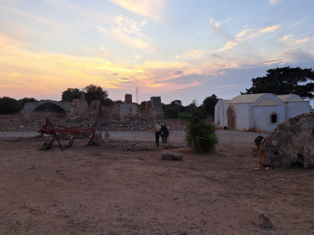 <Mit herrlichlichen Aussichten auf das Meer wandern Sie wieder den Kamm entlang nach Dipkarpas, dem letzten Dorf auf der Halbinsel. Noch einige Griechen leben hier. Der Ort besteht aus vielen, weit verstreuten Gehöften mit kleinen Gärten und Feldern, Zitronen und Orangenhainen. Hibiscus, Jasmin, Bougainvillea und Oleanderblüten schmücken die Häuser.