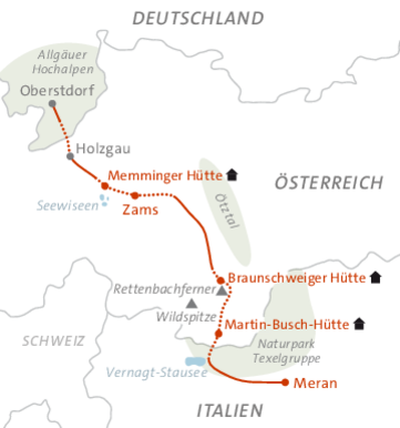 - PKW: Steht dein Auto in Oberstdorf, bietet sich die Rückreise mit dem Shuttle-Bus unseres Partners an. Der Transfer erfolgt um 8:00 Uhr ab Bahnhof Meran bis Oberstdorf und ist auf Anfrage bei uns buchbar - bitte bei Buchung angeben.