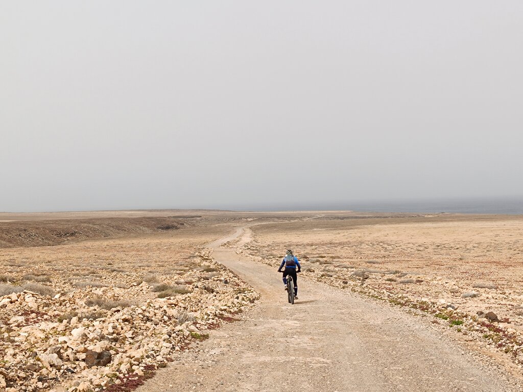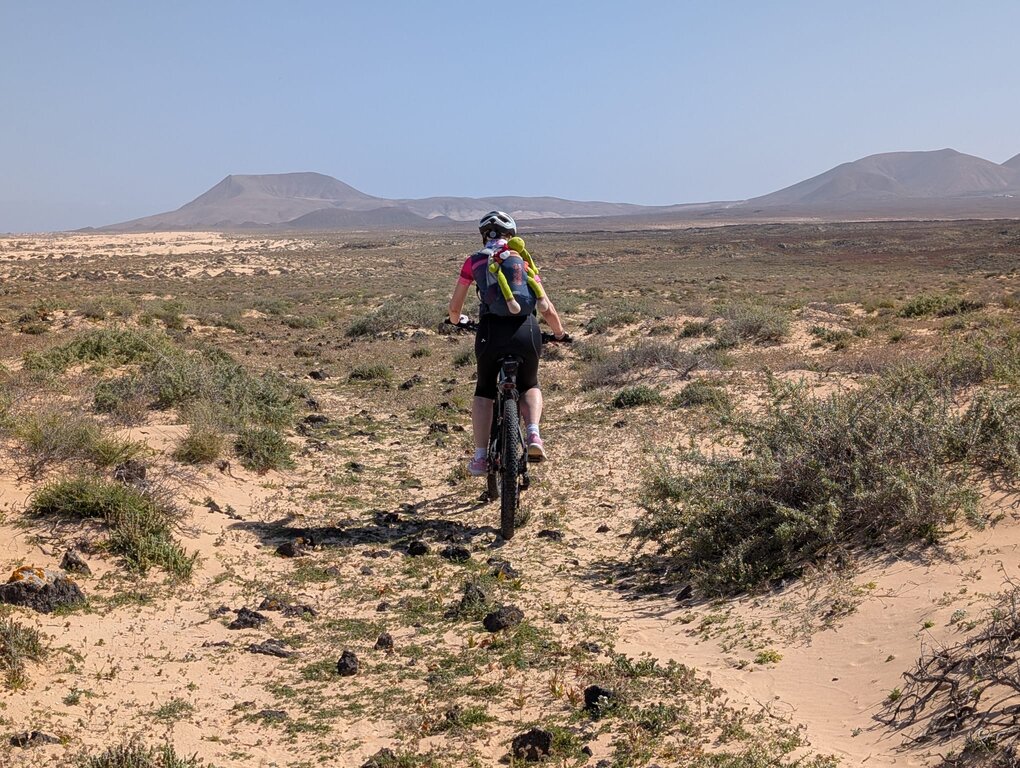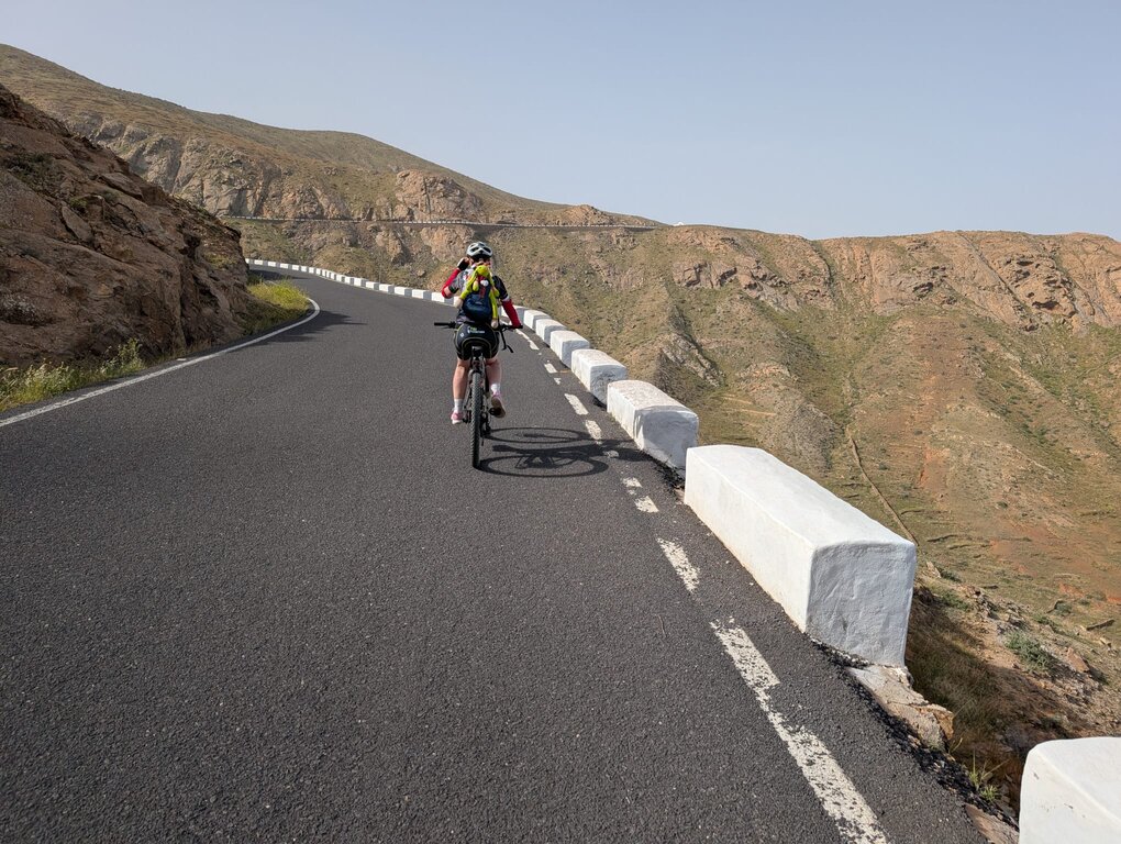 <Sie fahren weiter nach Süden, zuerst durch die Schlucht zur Vega del Río Palma (wo Mitte September die Wallfahrt zu Ehren der Schutzheiligen der Insel, La Virgen de La Peña, stattfindet, mit einem großen Zustrom von Pilgern aus der ganzen Insel) und dann auf der spektakulären Straße von Betancuria nach Pájara. Von hier aus radeln Sie abschnittsweise auf der GR (Gran Ruta), die die Insel überquert. In La Pared angekommen radeln Sie auf den weißen Sandwegen, die uns in die Wüste führen, um Costa Calma, unsere letzte "Oase", zu erreichen.