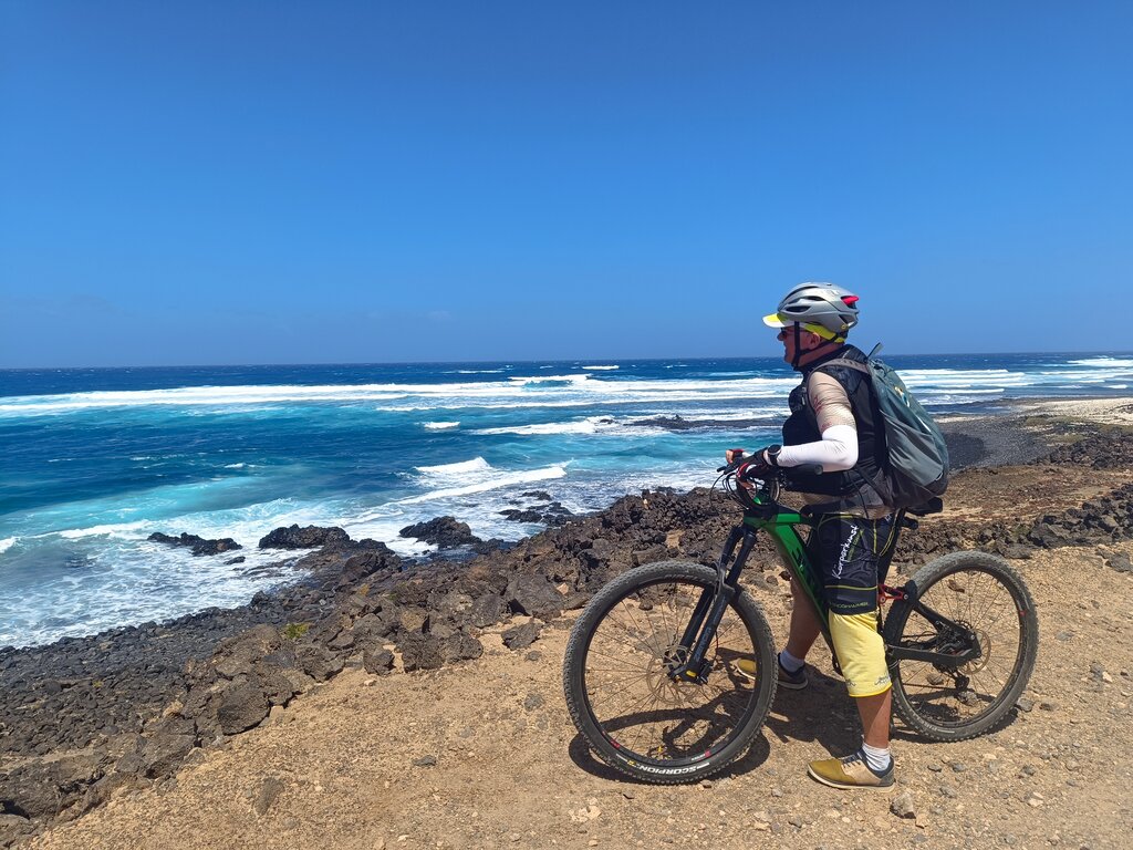 <Diese zweite Etappe beginnt in Villaverde (La Oliva) im Norden und führt Sie zu einigen nahe gelegenen Vulkanen. Dann fahren Sie hinunter zu dem kleinen Fischerort Manjanicho und vorn dort auf dem breiten Küstenweg weiter bis zum Leuchtturm, einem bei Sufern sehr beliebten Ort. . Von hier aus kommen Sie in die Stadt El Cotillo (ein guter Ort, um wieder zu Kräften zu kommen), ein Surfparadies auf Fuerteventura mit einigen beeindruckenden goldenen Sandstränden. Anschließend kehren Sie durch einsame Schluchten von Sandsteinformationen nach La Oliva zurück.
