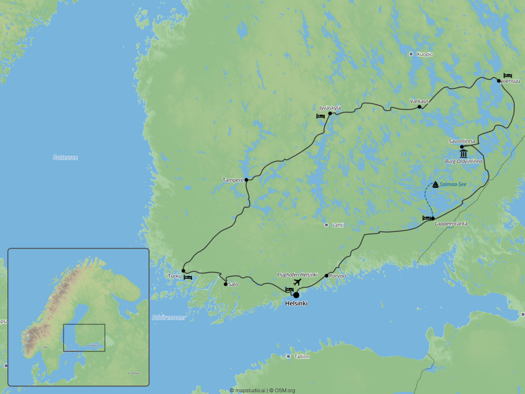 Auf dieser Finnland-Rundreise entdecken Sie das Land der tausend Seen in all seiner ruhigen Ursprünglichkeit. Die Reise führt durch weitläufige Seen- und Waldlandschaften, vorbei an glasklaren Gewässern, kleinen Ortschaften und historischen Städten wie Helsinki, Savonlinna und Turku. Unterwegs erleben Sie die enge Verbindung der Finninnen und Finnen zur Natur, genießen eine Bootsfahrt auf dem Saimaa-See und begegnen Regionen mit karelischem Erbe und orthodoxen Einflüssen. Diese Reise verbindet Naturerlebnis, Kultur und entspanntes Unterwegssein zu einer harmonischen Auszeit im Norden Europas.
