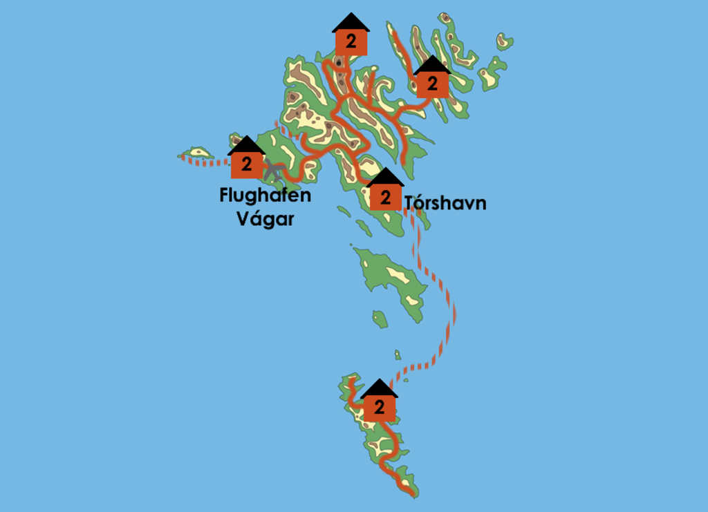Die Inseln Vágar und Streymoy sowie Streymoy und Borðoy sind durch kostenpflichtige Unterseetunnel verbunden. Die Durchfahrten werden automatisch registriert und die Abrechnung der Tunnelgebühren erfolgt direkt mit dem Mietwagenanbieter. Bitte informieren Sie sich vor Ort beim Mietwagenpartner über die aktuell geltenden Tunnelgebühren.Fährverbindungen sind nicht im Reisepreis enthalten. Die Fähre zwischen Tórshavn und Suðuroy verkehrt regelmäßig 2-3 mal täglich. Die Fähren zwischen Tórshavn und Nólsoy sowie Klaksvík und Kalsoy fahren ebenfalls mehrmals täglich. Der öffentliche Bus auf Kalsoy verkehrt abgestimmt auf die Fähre. Die Fähre auf die Insel Mykines legt morgens im Hafen von Sørvágur ab. Die letzte Rückfahrt von Mykines ist am frühen Abend. Die Überfahrt dauert ca. 45 Minuten. Tagesausflüge sind nur im Zeitraum vom 01. Mai - 31. August möglich.