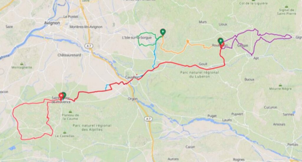 <Lassen Sie heute das Wasser hinter sich und wagen Sie sich tiefer in das Luberon-Tal vor, wobei Sie ein oder zwei seiner spektakulärsten Dörfer auf Hügelkuppen besuchen. Obwohl die Strecke kurz ist, gibt es heute drei Anstiege auf der Route, beginnend direkt beim Verlassen von Fontaine-de-Vaucluse – aber keine Sorge, die Landschaft macht dies mehr als wett! Nach einem Abschnitt durch die Landschaft, vorbei an Weinbergen und Olivenbäumen, führt die Route hinauf nach Gordes, einem beliebten Urlaubsort von A-Prominenten und einem großartigen Aussichtspunkt über das Luberon-Tal. Anschließend geht es hinunter auf den Talboden, und die Route setzt sich ostwärts fort, vorbei an Lavendelfeldern, bis Sie sich den ockerfarbenen Klippen von Roussillon nähern.