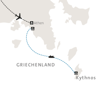 Individuelle Anreise nach Athen. Bitte achten Sie auf die Flugzeiten: Sie sollten in Athen spätestens um 12.00 Uhr landen, um eine passende Fährverbindung nach Kythnos zu erreichen. Falls dies nicht möglich ist, kann eine Zwischenübernachtung notwendig sein.