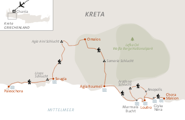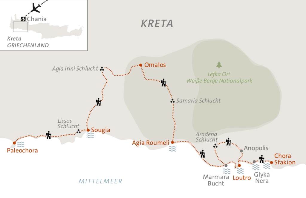 <Am Fuß der steil abfallenden Küstenberge wanderst du vorbei an kleinen und größeren Kieselstränden. Die byzantinische Kirche des Agios Pavlos und schattenspendende Kiefernwälder sorgen für abwechslungsreiche Eindrücke. In der abgelegenen Marmara-Bucht kannst du ein erfrischendes Bad genießen und dich in der Taverne hoch über der Bucht kulinarisch stärken. Weiter geht es entlang der Küste bis nach Loutro, einem autofreien Fischerdorf in einer sichelförmigen Bucht mit kristallklarem Wasser – ein perfekter Ort zum Entspannen und Staunen.