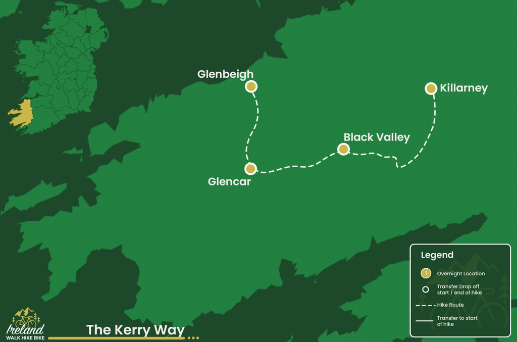 Beginnen Sie eine bemerkenswerte 5-tägige selbstgeführte Kerry Way Wanderung, die die atemberaubende natürliche Schönheit und das reiche kulturelle Erbe von County Kerry enthüllt. Ihre Reise startet in der charmanten Stadt Killarney – oft als Tor zu Irlands ikonischsten Landschaften betrachtet – wo detaillierte Routenpläne, Insider-Tipps und unsere GPS-App sicherstellen, dass Sie in Ihrem eigenen Tempo erkunden können. Von Killarney aus folgen Sie landschaftlich reizvollen Wegen, die sich durch sanfte Hügel schlängeln, entlang ruhiger Seen führen und an jahrhundertealten Steinbauten vorbeigehen, wodurch Sie in den authentischen Geist der Smaragdinsel eintauchen. Während Sie den berühmten Kerry Way erkunden, bringt jeder Tag neue Ausblicke und Entdeckungen: gewundene Pfade, die zu idyllischen Dörfern führen, historische Sehenswürdigkeiten voller Tradition und versteckte Schätze, die einen Einblick in Irlands geschichtsträchtige Vergangenheit bieten. Diese Tour ist perfekt für erfahrene Wanderer ebenso wie für begeisterte Einsteiger und verbindet körperliche Abenteuer mit kultureller Entdeckung. Nach einem erfüllten Tag auf dem Weg kehren Sie in sorgfältig ausgewählte Unterkünfte zurück, die einen warmen, erholsamen Rückzugsort und einen Vorgeschmack auf echte irische Gastfreundschaft bieten. Ob Sie die Panoramablicke von Klippen genießen oder einfach die ruhigen Landschaften erleben, die County Kerry prägen – jeder Moment dieser selbstgeführten Tour verspricht unvergessliche Erinnerungen. Nehmen Sie die Herausforderung und den Charme des Kerry Way an und entdecken Sie, warum diese Route ein Muss für alle ist, die ein authentisches irisches Outdoor-Erlebnis suchen. Buchen Sie noch heute Ihre 5-tägige selbstgeführte Kerry Way Wanderung mit Ireland Walk Hike Bike und erleben Sie den zeitlosen Reiz von Irlands rauer und faszinierender Landschaft.