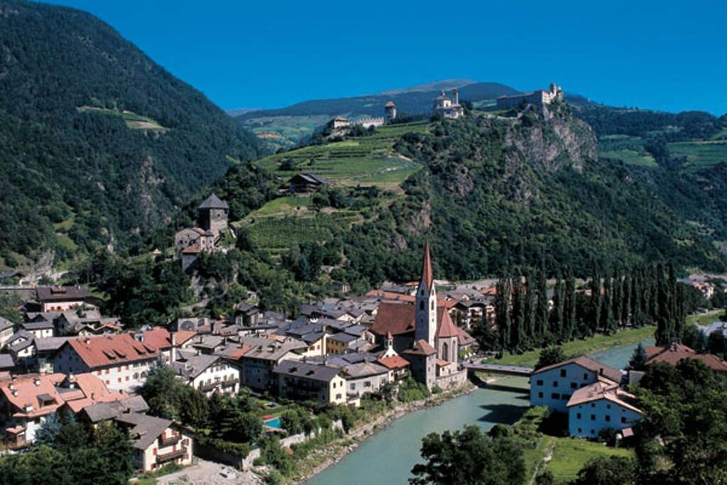 Stadt Bruneck radeln. Nach einer kurzen Steigung auf das sonnige Hochplateau mit seinen Ortschaften Pfalzen, Issing und Terenten geht es weiter zu den Ruinen der Mühlbacher Klause ins Eisacktal und Ihr heutiges Etappenziel