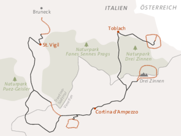 PKW: Von Norden kommend auf der Brennerautobahn (A13, mautpflichtig) über Innsbruck und den Brennerpass (Autobahnausfahrt Brixen) und weiter Richtung Toblach. Du kannst dein Fahrzeug für die erste Nacht beim Hotel parken und anschließend direkt zur Talstation der Helmbahn fahren. Dort gibt es einen öffentlichen, gebührenpflichtigen Parkplatz, wo du dein Fahrzeug für die Dauer der Reise abstellen kannst. Bitte beachte jedoch, dass es sich um einen öffentlichen Parkplatz handelt und Reservierungen nicht möglich sind. Daher empfehlen wir die Anreise mit der Bahn.