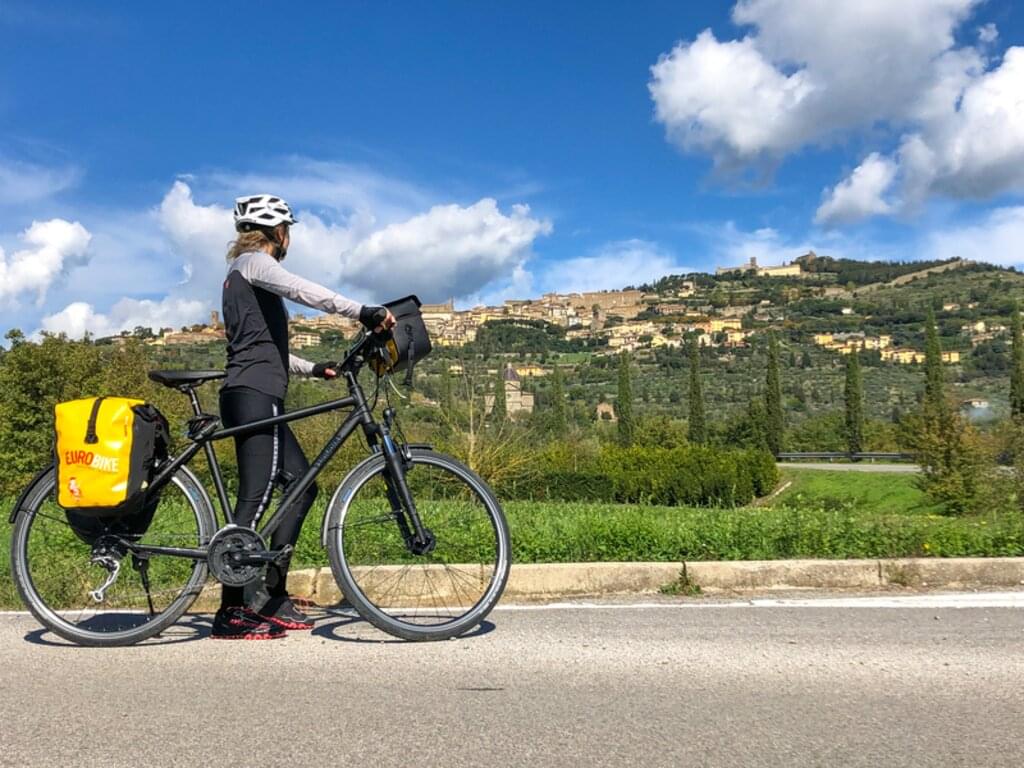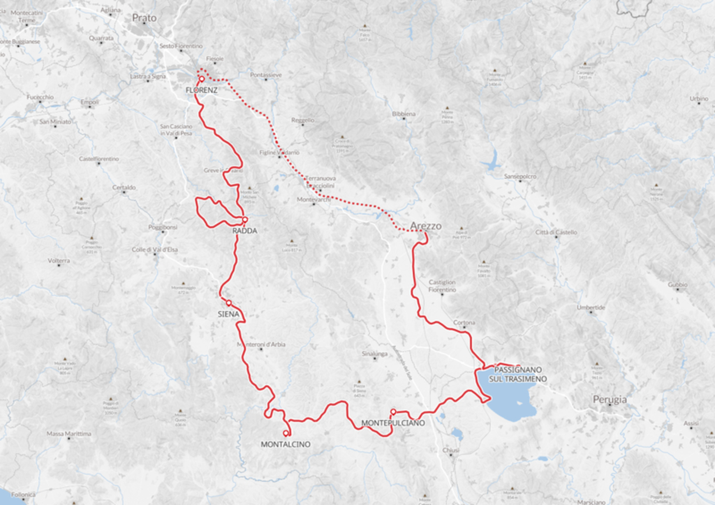 Geradelt wird überwiegend im hügeligen Gelände und so sind ab der zweiten Radetappe täglich mehrere, auch kräftige, Anstiege zu meistern. Streckenführung auf verkehrsarmen Nebenstraßen und den sogenannten Strade Bianche. Dabei handelt es sich um nahezu verkehrsfreie, gut zu radelnden Schotterstraßen. Bei Stadtein- und Ausfahrten muss fallweise mit stärkerem Autoverkehr gerechnet werden.