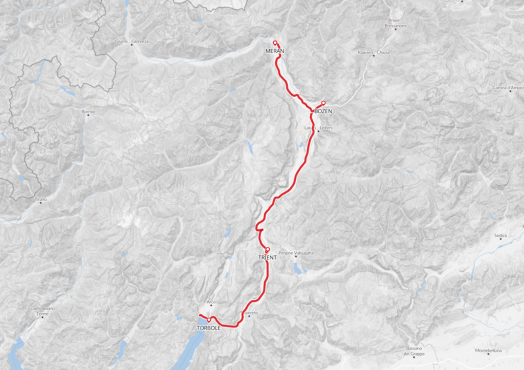 Aus Bozen raus begleitet die Radfahrer der Fluss Eisack, dann ist bald die Etsch erreicht und der herrliche Radweg führt durch die Obstgärten bis Salurn, wo das deutschsprachige Südtirol endet. Nun begleiten die Weinreben des kräftigen Rotweins „Teroldego“ bis in die sehenswerte Altstadt von Trient.
