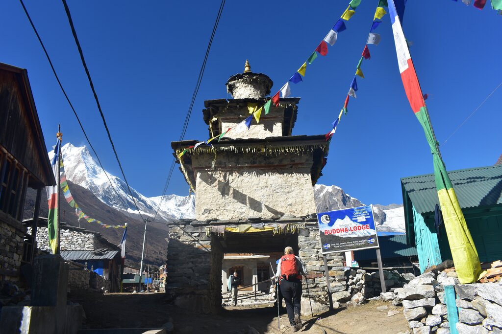 Von hier aus geht es über einen weiteren Bergrücken hinauf, dann überqueren Sie den Budi Gandaki über eine Hängebrücke. Von hier aus wandern Sie über eine breite Steintreppe bis zum Kamm des Dobhan. Nachdem Sie eine weitere Hängebrücke über den Yaru Khola überquert haben, steigen Sie eine Steintreppe hinauf und wandern dann hinunter zum Fluss und über weitere Steintreppen nach Tharo Bharyang.