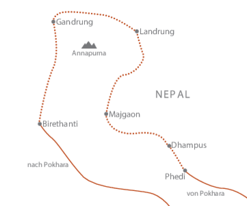 Du steigst steil bergab bis zum Flussbett des Modi Khola, um auf der anderen Seite wieder aufzusteigen, bis du auf einer Höhe von 1.940 m den Ort Gandrung erreicht hast. Nach dieser relativ kurzen Etappe hast du genügend Zeit, um die fantastische Lage unserer Lodge zu genießen, die wie auf einem Aussichtsbalkon über dem Tal thront. Die Aussicht auf die Annapurnakette ist überwältigend.