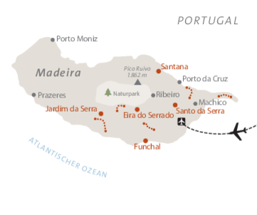 <Du landest auf Madeira. Die Anreise zu deiner ersten Unterkunft in Santo António da Serra erfolgt individuell. Auf Wunsch kannst du auch einen bequemen Flughafentransfer über uns buchen.