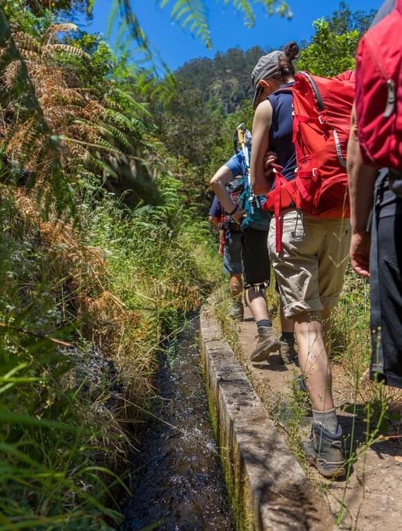 <Der Weg führt dich auf die Nordseite Madeiras. Du wanderst der Fließrichtung entgegen und tauchst immer tiefer in die ursprüngliche Vegetation der Insel ein: den ewig grünen Lorbeerwald. Die Levada bringt hier das kalte Wasser aus Ribeiro Frio auf die Sonnenseite Madeiras. Je weiter du dich von der Zivilisation entfernst, desto uriger wird die Levada: von Moosen überwachsen und von Farnen überwuchert. Vergiss heute deine Lampe nicht, denn es geht durch Tunnels und vorbei an Wasserscheiden.