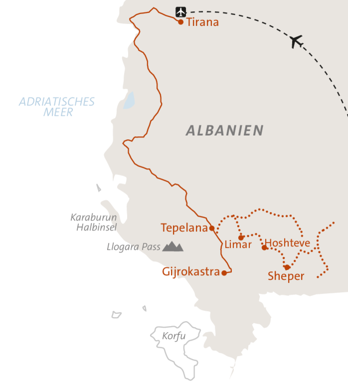 <Am Flughafen in Tirana werden Sie in Empfang genommen und erhalten die Infomaterialen für Ihre Tour. Transfer gemeinsam mit anderen Reisenden in den Süden Albaniens bis nach Tepelena oder Peshtan. Unterwegs können Sie erste Eindrücke sammeln.