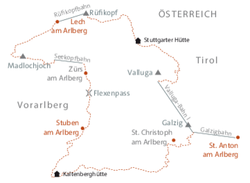 • Lindau – Bregenz – Rheintalautobahn A14 bis Bludenz – weiter Arlberg-Schnellstraße S 16 – Arlbergtunnel – Ausfahrt St. Anton am Arlberg – weiter bis zur Hoteladresse.