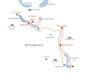 <Von St. Wolfgang führt Ihre Route entlang des Sattlweges zum Schwarzensee, wo die Seehütte der Lore mit Köstlichkeiten wartet. Durch die Wirerschlucht ins Tal und um den Bürglstein herum zur Seepromenade in Strobl. Mit dem Bus geht es in die alte Kaiserstadt Bad Ischl. -
