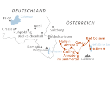 Der Salzalpensteig ist eine sich über 250 Kilometer länderübergreifend erstreckende Wanderung, die vom Chiemgau über das Berchtesgadener Land hinein in die bezaubernde Welterberegion nach Hallstatt führt. Eine ganze Landschaft ist namentlich mit dem Salz verbunden – das Salzkammergut in Österreich, dieses ist auch Teil dieser faszinierenden Wandertour. Die Geschichte des Salzes, von seiner Gewinnung und dem Transport des ehemals teuren und begehrten Handelsguts, begleitet die Wanderer. Früher wurde Salz als ‘weißes Gold’ bezeichnet; wie wertvoll es war, macht beispielsweise die Ration an Salz “salarium” als Teil des Soldes an römische Legionäre deutlich. Sehenswert sind die Besucherbergwerke, in denen man die Gewinnung des Salzes vor Ort miterleben kann. Über Jahrhunderte hinweg brachten Salzvorkommen den betreffenden Orten Wohlstand und kulturellen Aufschwung. Freuen Sie sich auf eine Reise vor einer wunderbar vielfältigen Naturkulisse mit rauschenden Wasserfällen, glitzernden Seen und alpinen Steigen.