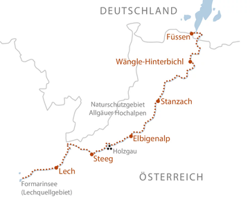 Auf dem Lechweg: Vom Ursprung des Lech bis zu den Königsschlössern in Füssen Begleite den Lech auf seiner Reise – vom klaren Quellwasser im Hochgebirge bis zu seinem ruhigen Lauf durch das Voralpenland. Auf dieser individuellen Wanderreise folgst du einem der letzten wilden Flüsse Europas. Der Weg führt dich durch drei Regionen und zwei Länder – von den Gletschern des Arlbergs über die sanften Täler des Lechtals bis in die Seenlandschaft rund um Füssen. Unterwegs wechseln sich alpine Panoramen, tosende Wasserfälle, tiefe Schluchten und weite Auenlandschaften ab. Du überquerst schwindelerregende Hängebrücken, wanderst durch idyllische Bergdörfer und genießt immer wieder Blicke auf das türkisblau schimmernde Wasser des Lech. Der „Best of Lechweg“ vereint die schönsten Etappen des Originalwegs – perfekt zusammengestellt für alle, die das Wesentliche dieser besonderen Route erleben möchten: Natur, Bewegung und stille Momente am Fluss.