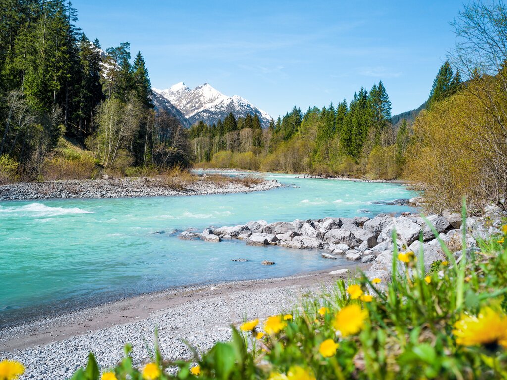 <Die heutige Etappe hält atemberaubende Ausblicke bereit: Zwischen Lech und Warth hat sich der Fluss tief ins Tal eingeschnitten. Dein Wanderweg verläuft hoch über der Lechschlucht, wo du immer wieder durch das dichte Grün hinab ins magische Türkis des Flusses blickst. Diese Mischung aus alpiner Weite, schroffen Felswänden und dem leuchtenden Wasser macht den Lechweg so besonders. Dein Ziel ist das idyllische Bergdorf Warth – ein Ort, der für seine Ruhe, Ursprünglichkeit und die Nähe zur Natur geschätzt wird. Von dort fährst du mit dem öffentlichen Bus weiter nach Holzgau zu deiner nächsten Unterkunft.