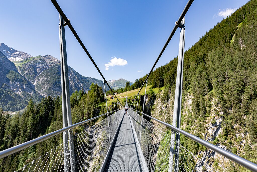 <Ein unvergesslicher Moment: In Holzgau überquerst du eine der längsten Fußgängerhängebrücken Österreichs – über 200 m lang und 110 m hoch! Wer lieber festen Boden unter den Füßen hat, nimmt den offiziellen Lechweg. Dein Ziel ist Elbigenalp, die kulturelle Mitte des Lechtals und Heimat der berühmten Holzschnitzkunst.