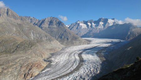 <Einem Feuerwerk ähnlich folgen sich einmalige Aussichtpunkte: Im Norden ein herrlicher Blick auf den Aletschgletscher, das Herz des UNESCO-Welterbes, und im Süden auf die Walliser Viertausender. Sanfter Abstieg zum Märjelensee. Wollgräser und kleine Seen bilden Kontraste zu Fels und Eis. Zum Schluss der Tour durch den Tälligrattunnel zur Fiescheralp.