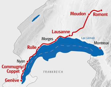 <Cäsar gründete Nyon, der Salon von Madame de Staël in Coppet war Treffpunkt Intellektueller, und bis heute lieben die Reichen und Berühmten den Lac Léman. Als Pilgernde können Sie darüber nachdenken oder einfach die reizvolle Landschaft geniessen.
