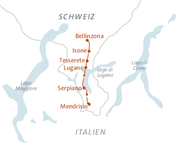 Die Täler sind einsam, die Höhenwege aussichtsreich und die Städte strotzen nur so vor Lebenslust und Italianità. Diese Wanderreise führt Sie durch die südlichste Ecke der Schweiz von den erhabenen Burgen Bellinzonas durch das quirlige Lugano und weiter nach Mendrisio. Unterwegs erwarten Sie kleine, traditionelle Dörfer mit typischen Grotti. Hier werden lokale Spezialitäten serviert und Gäste mit Charme bedient. Die Ausblicke auf die vielen Seen in dieser Region begleiten Sie auf Ihrem Weg zu den Höhepunkten des Tessins.