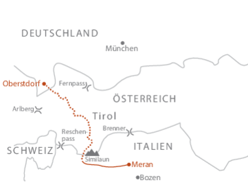 - PKW: Steht dein Auto in Oberstdorf, bietet sich die Rückreise mit dem Shuttle-Bus unseres Partners an. Der Transfer erfolgt um 8:00 Uhr ab Bahnhof Meran bis Oberstdorf und ist auf Anfrage bei uns buchbar - bitte bei Buchung angeben.