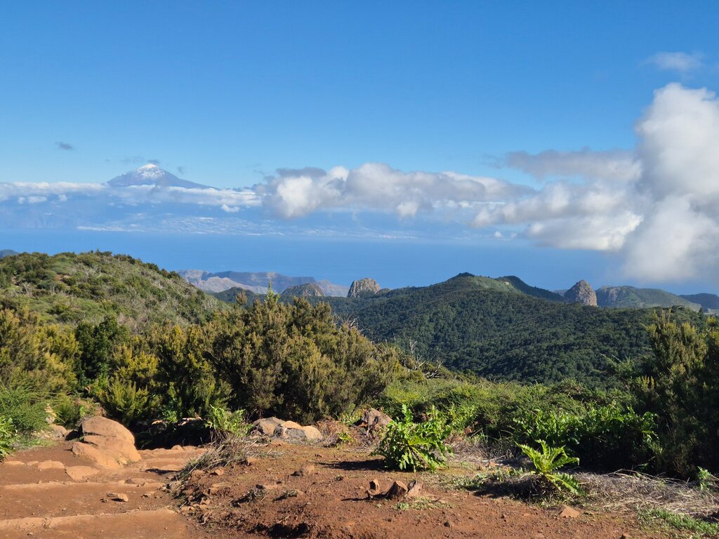 <Von den Häusern, Gärten und Terassenfeldern des Hermigua - Tals wandern Sie Richtung Nationalpark Garajonay, welches das grüne Herz der Insel ist. Hier tauchen Sie ein in den dichten Lorbeerbaumwald, der die nördliche Seite der Insel bedeckt. Der Weg führt steil hinauf unter die verbogenen Stämme der Lorbeerbäume, die mit Moos und Flechten bedeckt sind. Auf der Spitze belohnt Sie der Ausblick. Zu sehen sind La Palma, El Hierro und der atemberaubende Vulkankegel des Teide auf Teneriffa. Nach einem kurzen Abstieg endet der Tag in Chipude. -