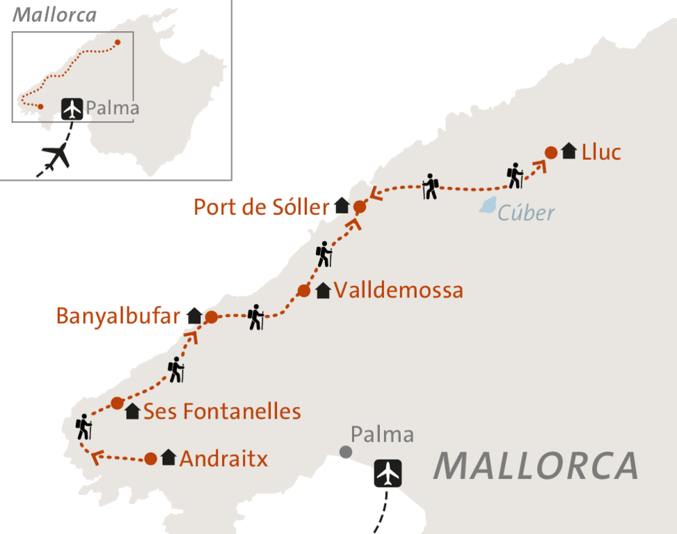 Der GR 221 zählt zu den schönsten Weitwanderwegen Europas – bekannt für spektakuläre Ausblicke, üppige Vegetation und historische Pfade. Meist bedeutet dies jedoch auch Verzicht auf Komfort. Bei dieser Variante ist das anders: Du übernachtest in kleinen, charmanten Unterkünften, genießt Privatsphäre und den Service des Gepäcktransfers. So wanderst du unbeschwert nur mit dem Tagesrucksack, während dein Gepäck bereits im nächsten Hotel auf dich wartet. Diese Genussvariante des GR 221 verbindet das intensive Naturerlebnis mit Komfort und Freiheit – perfekt, um die Serra de Tramuntana in all ihrer Schönheit zu entdecken.