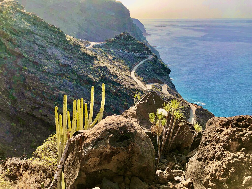 <Einer der schönsten Abschnitte des Camino reals erstreckt sich im Nordosten der Insel. Im Auf und Ab durch die Schluchten diente dieser Weg als Verbindung zwischen den Dörfern. Neben der Banane, die auf der Insel angebaut wird, wanderst du durch üppige Sukkulentenvegetation und mit stetem Blick auf den Atlantik. Taxitransfer nach Los Sauces und Bus-Rückfahrt vom Puntallana -> Santa Cruz.