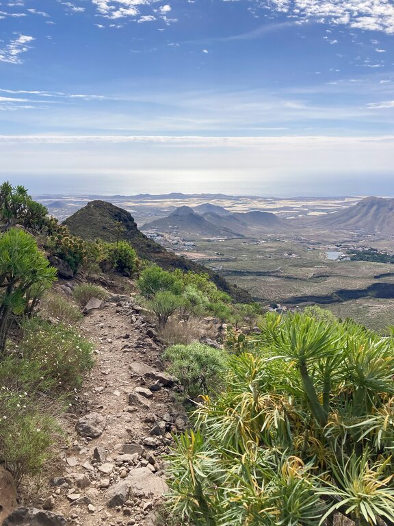 <Am Parador de las Cañadas schnürst du die Stiefel für eine weitere Etappe entlang des GR131, heute bis Vilaflor. Schon auf den ersten Metern fesseln dich die Kontraste aus Felsen und endlosen Lavameeren. An der Abzweigung Richtung Süden steigt der Pfad schmal und steinig zum Pass Degollada de Guajara an, einen fordernden Abschnitt, der dich Schritt für Schritt in die Höhe zieht. Oben belohnt dich ein weitläufiger Ausblick: der Teide im Rücken, unter dir das Lavameer, vor dir weite Pinienhaine, die tiefe Schlucht Barranco del Río und das glitzernde Meer.