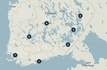 <Die Route führt durch das Herz der berühmten finnischen Seenlandschaften. Unterwegs wird ein Halt in Savonlinna empfohlen, wo die mittelalterliche Burg Olavinlinna dramatisch auf einer Insel im See liegt.