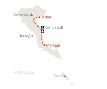<Mit dem öffentlichen Bus erreichen Sie in ca. 20 min. den kleinen Küstenort Benitses. Von hier aus steigen Sie durch einen schattigen Wald bergauf, wandern durch Olivenhaine bis nach Agioi Deka, wo Sie Ihre Wasserflasche an der Quelle auffüllen können. Nun geht es bergab und Sie durchwandern Pikantika und Achilleio, zwei malerische kleine Dörfer, bevor Sie Benitses erreichen, wo sich der Kreis schließt. Sie können in einem der Cafés am Dorfplatz ausruhen, bevor Sie mit dem Bus zurück nach Messonghi fahren. -