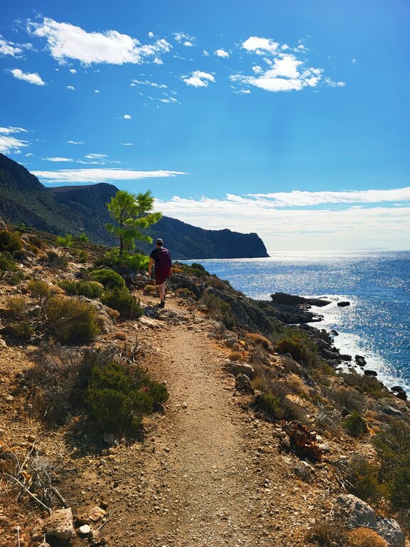 <Am Fuß der steil abfallenden Küstenberge wanderst du vorbei an kleinen und größeren Kieselstränden. Die byzantinische Kirche des Agios Pavlos und schattenspendende Kiefernwälder sorgen für abwechslungsreiche Eindrücke. In der abgelegenen Marmara-Bucht kannst du ein erfrischendes Bad genießen und dich in der Taverne hoch über der Bucht kulinarisch stärken. Weiter geht es entlang der Küste bis nach Loutro, einem autofreien Fischerdorf in einer sichelförmigen Bucht mit kristallklarem Wasser – ein perfekter Ort zum Entspannen und Staunen.