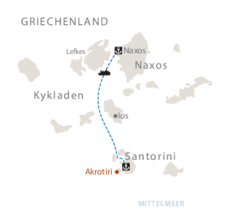 <Heute fahren Sie von Santorini nach Naxos. Am Morgen können Sie noch einen kurzen Rundgang von Akrotiri entlang der Caldera machen oder Sie besuchen die berühmte Ausgrabungsstätte Akrotiri, die nur wenige Gehminuten von Hotel entfernt liegt. Die Fähre legt normalerweise gegen 15:30 Uhr ab und kommt 2,5 Stunden später in Naxos an. Sie können das Schloss in Naxos Stadt (Chora) besuchen oder einen kurzen Spaziergang zum Kloster von Chrisostomos machen. -