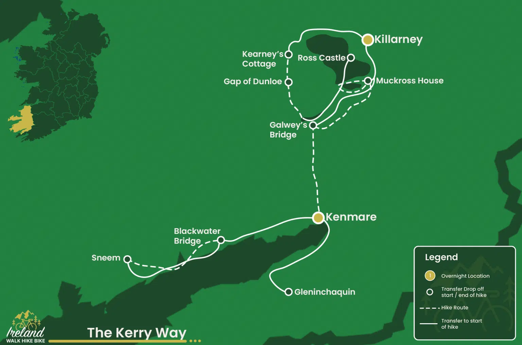 Entdecken Sie den verborgenen Charme der Grafschaft Kerry in Ihrem eigenen Tempo mit unserer Selbstgeführten Kerry Way Comfort-Wanderreise – eine sorgfältig gestaltete Tour, die Abenteuer und Entspannung entlang eines der beliebtesten Fernwanderwege Irlands vereint. Beginnen Sie Ihre Reise in der einladenden Stadt Killarney, wo lebendige lokale Kultur, jahrhundertealte Geschichte und atemberaubende Landschaften zusammenkommen und das perfekte Tor zur „Grünen Insel“ bilden. Diese Comfort-Wanderung ist ideal für Reisende, die ein ausgewogenes Erlebnis suchen – eine Kombination aus gemütlichen Tagesetappen und bereichernden kulturellen Begegnungen – während sie gleichzeitig hochwertige Unterkünfte und perfekt organisierte Logistik genießen. Mit detaillierten Routenbeschreibungen, Insider-Tipps und sorgfältig geplanten Stopps navigieren Sie mühelos durch eine beeindruckende Vielfalt landschaftlicher Highlights, die das wahre Wesen der Grafschaft Kerry offenbaren. Während Sie den Kerry Way in gemächlichem Tempo entlangwandern, enthüllt jeder Schritt eine neue Facette der natürlichen Schönheit Irlands. Schlendern Sie durch sanft geschwungene grüne Hügel und stille Täler, genießen Sie Panoramablicke auf ruhige Seen und entdecken Sie charmante Dörfer, die authentische irische Herzlichkeit ausstrahlen. Ideal für erfahrene Wanderer, die eine leichtere Herausforderung suchen, oder neugierige Reisende, die in die irische Kultur eintauchen möchten, ohne einem strengen Zeitplan zu folgen, verspricht die Selbstgeführte Kerry Way Comfort-Wanderreise ein unvergessliches und stressfreies Abenteuer. Genießen Sie die Freiheit, in Ihrem eigenen Rhythmus zu reisen, tauchen Sie in das reiche Erbe der Grünen Insel ein und schaffen Sie bleibende Erinnerungen entlang einer der ikonischsten Routen Irlands. Wenn Sie diese Region lieber mit einem lokalen Experten erkunden möchten, der Sie in die Geschichte und Natur dieser Gegend einführt – sehen Sie sich bitte unsere Geführte Wanderreise an.