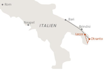 In den größeren Städten nutzen wir ausgewählte 3* und 4* Hotels und in den Dörfern und auf dem Land gemütliche freundliche ‘agriturismo’ (Bauernhöfe) und Pensionen. In Porto Badisco sind Sie in einer typischen “Masseria” ausserhalb der Stadt untergebracht. In allen Unterkünften verfügen die Zimmer über Bad und am Morgen wird Ihnen ein gutes italienisches Frühstück serviert. Diese Reise wird mit Frühstück angeboten, da Sie unterwegs zahlreiche Möglichkeiten haben, sowohl die hervorragende Küche der Gegend als auch eine breite Auswahl an Weinen der Region zu probieren. Nur in Porto Badisco und Marina Serra ist das Abendessen inbegriffen, da hier keine Lokale in der unmittelbaren Umgebung vorhanden sind.
