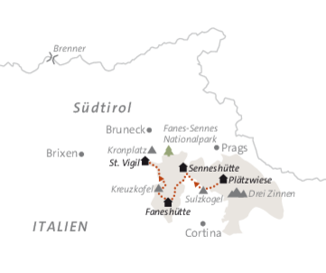 Genießen Sie Hochgebirgswanderungen durch ein wundervolles Naturschutzgebiet mit den atemberaubenden Landschaften der imposanten Kalksteinberge und schneebedeckten Gipfel, Postkartenalmen und idyllischen Bergwiesen. Dieser einzigartige, deutschsprachige Teil Italiens glänzt mit hervorragender Küche, einer artenreichen Tier- und Pflanzenwelt, in welcher Sie auch Murmeltiere und Gämse antreffen können. Im Frühling und Sommer blühen die Almwiesen in den schönsten Farben. Von Plätzwiese aus wandern Sie durch das Fanes-Sennes Naturschutzgebiet nach St. Vigilio di Marebbe und übernachten in wunderschön gelegenen Schutzhütten, wo Sie sich mit herzhaften Mahlzeiten für die atemberaubenden Wanderungen stärken können. Die Wanderungen verlaufen auf gut ausgeschilderten Wegen und sind anspruchsvoll lang, aber nicht erschöpfend.