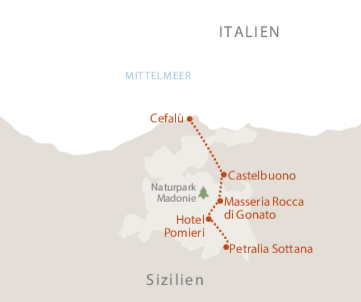 <Am Morgen bringt Sie ein Transfer zum Ausgangspunkt der Wanderung in Gangi, einem auf einem Hügel gelegenen mittelalterlichen Städtchen, das oft als einer der schönsten Orte Italiens bezeichnet wird. Der Beginn der Wanderung ist recht steil und verläuft durch die typisch sizilianische Landschaft. Sie kommen an antiken Masserie vorbei und genießen einen tollen Blick auf die sie umgebende Landschaft mit ihren sanften Hügeln und grünen Tälern und der Silhouette des Madonie Gebirgszugs in der Ferne. In Geraci Siculo erwartet Sie eine weitere bezaubernde mittelalterliche Stadt reich an Geschichte und lebendiger Kultur. Geraci Siculo ist bekannt für seine gut erhaltene Ruine eines normannischen Schlosses und stellt ein bezauberndes Ziel Ihrer Wanderung dar.