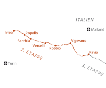 Sie absolvieren die zweite Strecke auf der Via Francigena: Sie verlassen die alpine Landschaft und betreten die Poebene, eine der größten Ebenen Europas. Sie entdecken das riesige Reisanbaugebiet, die Flüsse Tessin (Ticino) und Sesia und noch grenzenlosen Felder, alles zwischen den Alpen und dem Apennin. Die Tradition der Bauernhöfe und die kleinen Dörfer entlang der Flüsse sind die Schwerpunkte dieses Abschnittes.