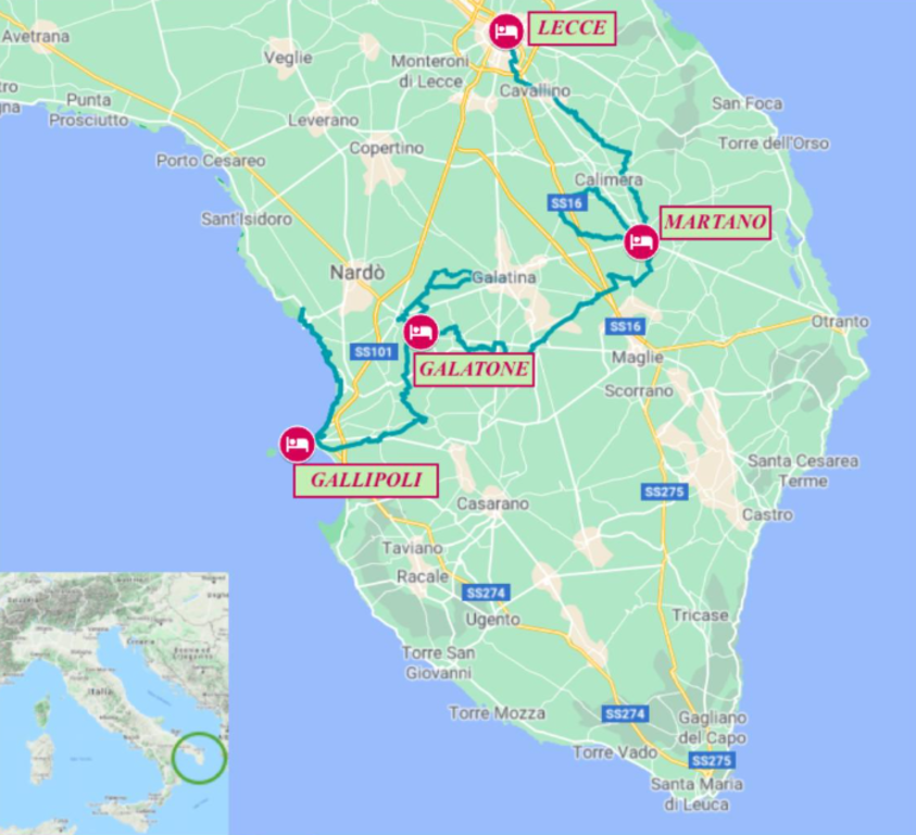 <Vollständig flache Strecke auf Nebenstraßen. Der erste Halt ist Cavallino, wo wir ein Freilichtmuseum über die messapische Zivilisation besuchen (das Volk, das hier vor der Ankunft der Griechen und Römer lebte). Danach geht es weiter durch Olivenhaine, die von Trockensteinmauern gesäumt sind, bis nach Calimera. Hier können Sie ein Naturkundemuseum besuchen und die typische Flora und Fauna der Region kennenlernen. Ziel des Tages ist Martano, die Hauptstadt der „Griechischen Salento“ (Grecìa Salentina).