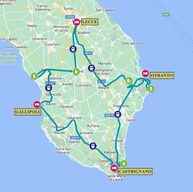 Zu Fuß von Gagliano del Capo / Castrignano del Capo zur Station Ruggiano-Salve (8,5 km). Zug nach Gallipoli (1,5 Stunden).