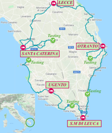 Salento liegt im äußersten Südosten Italiens, im sogenannten „Absatz des Stiefels“. In der Mitte des Mittelmeers gelegen, ist diese Region erfüllt von den Spuren zahlreicher Zivilisationen, die sie im Laufe der Jahrhunderte bewohnt haben: von den Messapiern über die Griechen und Römer bis hin zu den Normannen. Salento mit dem Fahrrad zu durchqueren ist wie eine Reise durch ein Freilichtmuseum. Prähistorische Dolmen, byzantinische Heiligtümer, die sich in Höhlen verbergen, barocke Kathedralen, abgeschiedene Küstenabschnitte – dies sind nur einige der Sehenswürdigkeiten, die man hier entdecken kann. Salento ist weltweit bekannt für seine traditionelle Küche, die Aromen aus Meer und Land vereint, sowie für seine Weinproduktion, insbesondere aus den Rebsorten Primitivo und Negroamaro. Diese einzigartigen Kombinationen begeistern alle Liebhaber von gutem Essen und Wein.