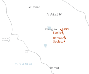 <Heute wandern Sie von Assisi nach Spello: eine schöne Strecke bergauf führt Sie über den Hang des Monte Subasio zur eindrucksvollen Einsiedelei „Eremo delle Carceri“. Sie können ein Taxi nehmen, um einen guten Teil des Aufstiegs zur