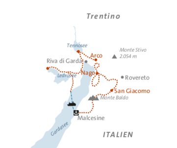 <Frische Bergluft, grüne Weiden und weite Ausblicke:om Hotel aus wanderst du auf Höhenwegen über den Monte Baldo, wo Alpenflora und mediterrane Vegetation aufeinandertreffen. Nach einem aussichtsreichen Abschnitt erreichst du die Bergstation oberhalb von Malcesine, von wo aus du per Seilbahn zum See hinabfährst. Genieße bei einem Bummel durch die pittoreske Altstadt das Flair des Ortes Malcesine und nimm vom Hafen das Schiff nach Riva del Garda. Am Hafen von Riva erwartet dich unser Shuttle, welches dich in die Hochebene des Ledrotals zu unserer Übernachtung am Ledrosee bringt. (Bitte beachte: Die Gondel- & Schifffahrt sind im Reisepreis nicht inkludiert)