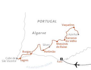 Quer durch das ursprünglich gebliebene bergige Hinterland an die traumhaft schöne felsige Südküste der Algarve... Die ersten 3 Etappen führen mitten durch die Hügel der „Serra“, eine kaum bewohnte völlig naturbelassene Gegend. Die Landschaft wird von Korkeichen, Eukalyptus- und Pinienhainen bestimmt, im Wechsel mit offenem Gelände, niedrigen Büschen wie Ginster, Zistrosen, Medronho und den typischen Macchia Feldern. Immergrüne Flusstäler werden durchquert, vorbei an elauen Stauseen mit atemberaubenden Aussichten über das unendliche Hügelmeer bis zum Küstengebiet.... immer vom Atlantik begleitet geht es auf ausgewählten Wegen entlang der faszinierenden Küste. Goldgelbe Felsklippen, einsame Badebuchten mit traumhaft schönen Ausblicken auf den tiefblauen Atlantik bis zum südwestlichsten Punkt Europas dem „Cabo de São Vicente”. Erleben Sie auf dieser Radreise die abwechslungsreiche einzigartige Landschaft!