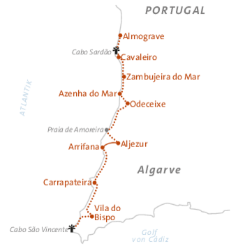Erwandern Sie im Angesicht des atlantischen Ozeans einen Teil des Fernwanderwegs E9. Wir haben für Sie den "Pfad der Fischer" ausgewählt, der Sie in den wunderschönen Naturpark der Costa Vicentina bringt. Der ausgezeichnet ausgebaute Weg führt Sie von Zambujera do Mar entlang der rauen Küstenlinie durch urige Fischerdörfer bis zum Cabo de São Vicente. An der Westküste der Algarve erwarten Sie fantastische Naturlandschaften: atemberaubende Aussichten über das Meer, kleine Buchten und Strände, die nur zu Fuß zu erreichen sind, Sanddünen, Korkeichenhaine und einzigartige Biotope. Unzählige Nester von Fischadlern und Weißstörchen schmücken die Felsen der Küste.