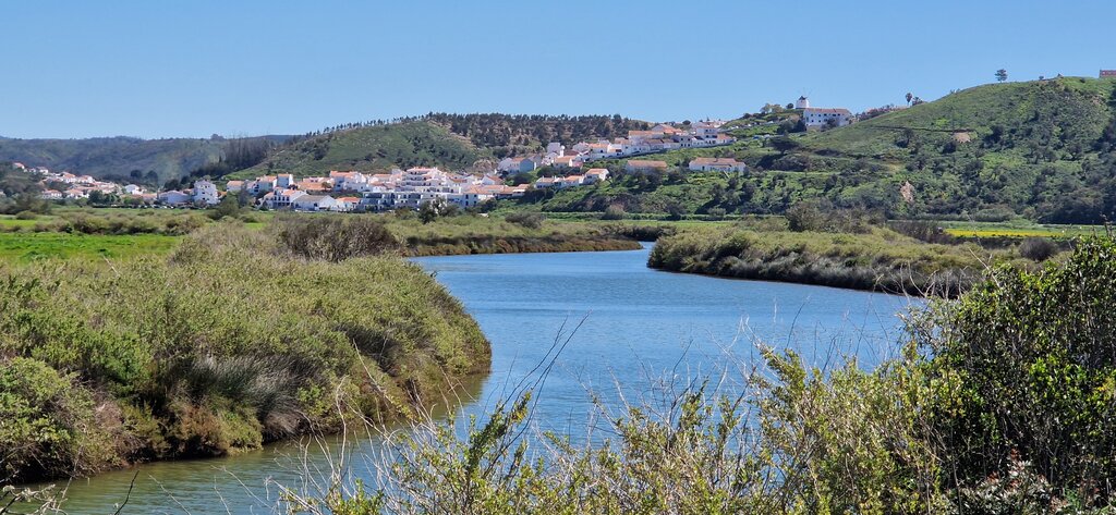 <Diese Etappe führt dich weg von der Steilküste hinein ins ruhige, grüne Hinterland. Der Alentejo, eine weitläufige Region im Süden Portugals, zeigt sich hier von seiner sanften und lebendigen Seite: Zunächst wanderst du durch offenes Weideland und duftende Macchia, bevor dich der malerische Fluss Torgal ein längeres Stück begleitet. Etwa auf halber Strecke erreichst du den Naturteich von Pego das Pias – ein idyllischer Ort, der zu einer erholsamen Pause und einer erfrischenden Abkühlung einlädt.